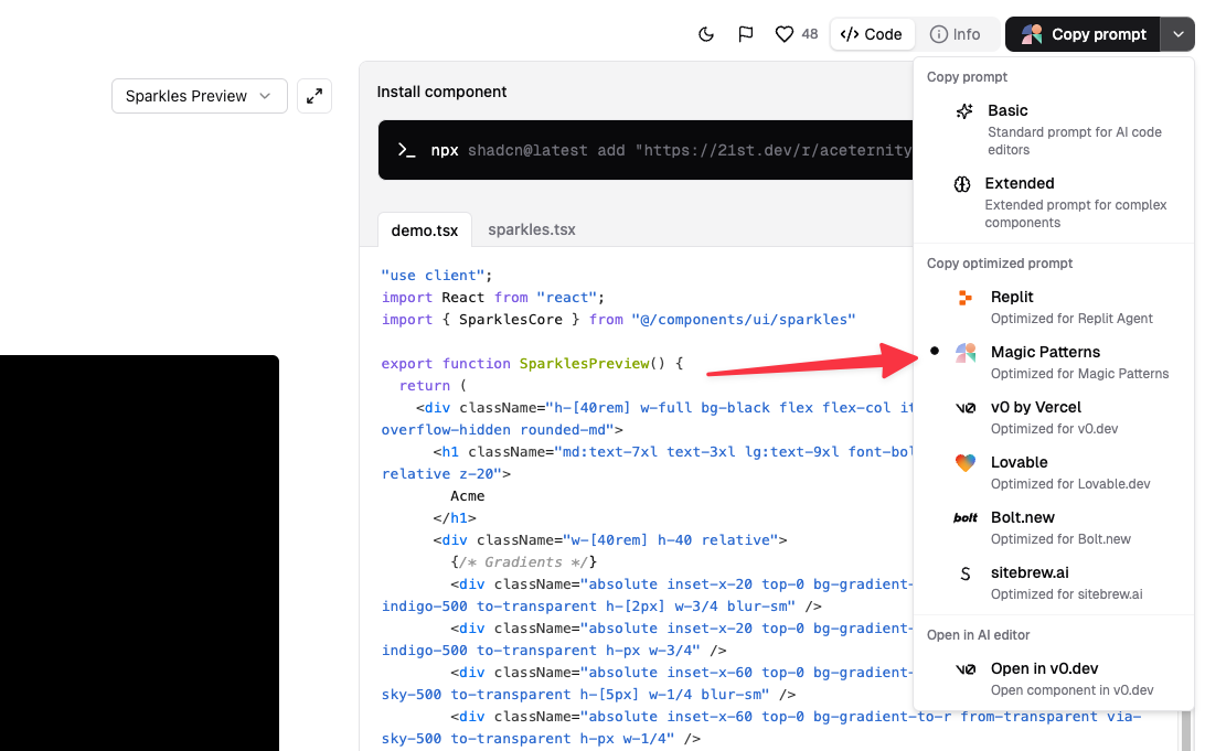 Inside of every component on 21st.dev starting today, there'll be an option to copy a prompt to use inside of Magic Patterns.